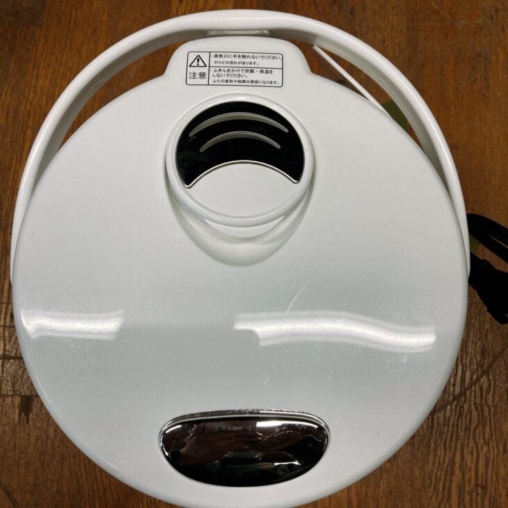 本体は外装下部や持ち手部分に軽度の汚れが見られましたが、割れや大きなへこみはなく、内釜のコーティングも保たれていました。付属の計量カップも揃っており、通電・炊飯の基本動作にも問題はありませんでした。全体として通常使用に支障のない状態と判断しました。