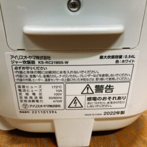 宮崎県門川町へアイリスオーヤマ ジャー炊飯器 KS-RC21M05-W買取 2022年製で状態良好のため適正価格で査定しました