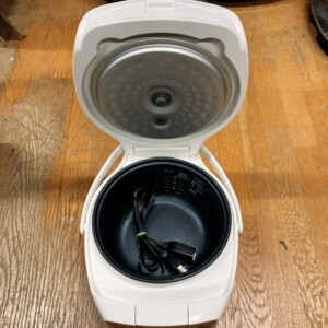 お預かりしたJAI-R551は、外装に小さな擦れや使用感は見受けられるものの全体的にきれいな状態でした。内釜のコーティングに目立つ剥がれはなく、底面の焦げ付きもほとんどありません。電源コードも付属しており、通電確認の結果、表示パネルやボタン操作にも問題はありませんでした。