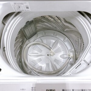お預かりしたNA-F5B2は、外装に細かな擦れや使用に伴うくすみが見受けられましたが、フタや操作パネルに大きな割れはなく、槽内も比較的清潔な状態でした。付属の給水ホースも揃っており、通電確認・動作確認ともに問題なく完了しています。