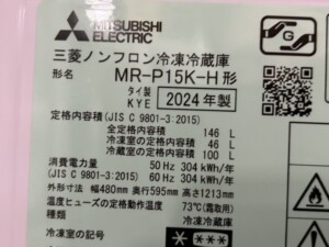 神奈川県三浦市にて三菱 MR-P15K-H形 冷蔵庫 2024年製 使用感少なめのため適正価格で査定しました