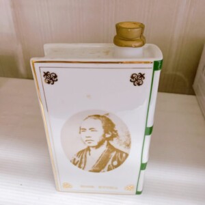 お預かりしたBOOK RYOMAは、陶器製のブック型ボトルに坂本龍馬の肖像があしらわれたデザイン性の高い焼酎です。全体的な割れや欠けは見られませんでしたが、ボトル上部や縁部分に経年による細かな汚れやシミが確認できました。キャップは付属しており、外観の大きなダメージはない状態でした。