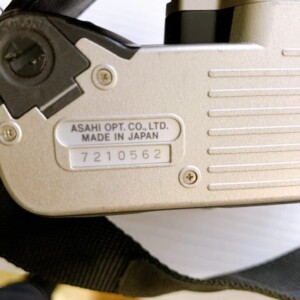 お持ちいただいたカメラは、シルバー×ブラックのボディにPENTAX純正 35-80mmズームレンズが装着された状態でした。レンズキャップ付きで、前玉・後玉ともに大きな傷は見られず、ガラス面は比較的きれいです。本体には経年保管による細かなスレやホコリの付着が確認できましたが、シャッターボタン・モードダイヤルの操作に違和感はなく、ファインダー内も極端な曇りは見られませんでした。底面ラベルにはASAHI OPT. CO., LTD. MADE IN JAPANの表記と製造番号のみがあり、年式の記載はありません。