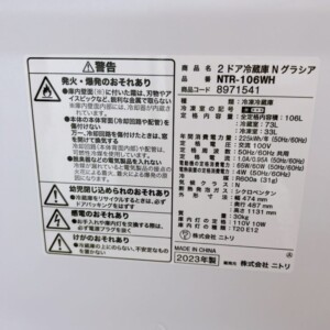 静岡県牧之原市でニトリ 2ドア冷蔵庫買取 Nグラシア NTR-106WH 2023年製 使用感を踏まえて査定しました