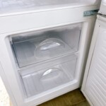 お引き取りした冷蔵庫は外装に目立つへこみや大きなキズはなく、全体的にきれいな状態でした。庫内も棚・ドアポケット・ケース類が揃っており、割れや劣化は確認されませんでした。冷却動作についても、冷蔵・冷凍室ともに問題なく動作しており、庫内灯の点灯も正常でした。
