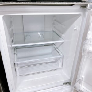 お預かりしたAQR-14R(W)は、外観に目立つへこみや深いキズはなく、白いボディも全体的にきれいな状態でした。庫内はガラス棚やクリアケース、製氷トレーもそろっており、使用感も少なめで清潔感のあるコンディションです。通電確認でも冷蔵・冷凍ともに問題なく動作しました。