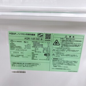 今回は阿南市にお住まいの30代男性より、AQUA ノンフロン冷凍冷蔵庫 AQR-14R(W)(2025年製)を出張買取にてご依頼いただきました。単身でお住まいの会社員のお客様からのお問い合わせで、賃貸アパートへのお伺いとなりました。