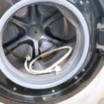 お預かりしたBD-SV110ARは、外装パネルに洗剤汚れや手垢が広範囲に付着しており、外観の汚れがかなり目立つ状態でした。一方でドラム内部は清掃されており、カビ臭や黒ずみは少なく、洗濯・乾燥ともに動作は良好。給排水ホースも揃っていました。