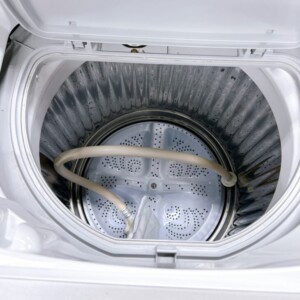 外装パネルには擦れ跡などの使用感が見られましたが、槽内はカビや洗剤残りがほとんどなく清潔な状態を保っていました。給排水ホースも揃っており、動作確認でも洗濯・乾燥ともに問題はありませんでした。