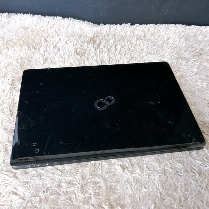 お預かりしたFMVA77YBは、ブラックの天板に細かな擦れや指紋跡が見られ、全体として使用感のある状態でした。キーボードのテカリやタッチパッド周辺の汚れも確認されましたが、液晶に大きな表示ムラやドット抜けはなく、通電後の起動や各キー入力、USBポートの認識も問題ありませんでした。ACアダプターも揃っており、実用面ではまだ十分に活躍できる一台でした。