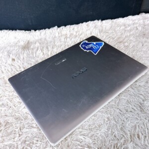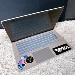 本体天板にはステッカー貼付および剥がし跡があり、全体的に擦り傷や線キズが確認できました。外観の使用感はやや強めでしたが、液晶割れや表示不良はなく、キーボードの入力反応も良好でした。通電・起動確認を行ったところ、OSの立ち上がりや基本操作に問題はなく、実用面では十分使用可能な状態でした。