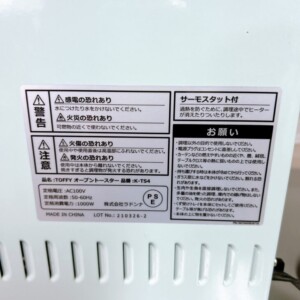 お預かりしたオーブントースターは、全体的に使用感が見られる状態でした。外装には細かな擦れがあり、天面には調理時に付着したと思われる薄い汚れが確認できました。庫内にはトレイ・焼き網が揃っており、通電および加熱動作に問題はありません。年式表記はありませんが、実用面を重視して状態を確認しています。