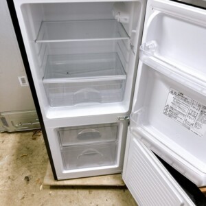 拝見したNTR-106BKは、庫内の棚やケースが揃っており、割れや欠けなどの大きなダメージはありませんでした。庫内は全体的に清潔で、目立つ汚れやニオイの残りは少ない状態です。一方で外装は黒色ボディの特性上、光の当たり方で分かる指紋跡や細かな擦れが見受けられました。動作確認では冷蔵・冷凍ともに問題なく、日常使用に支障がないことを確認しています。
