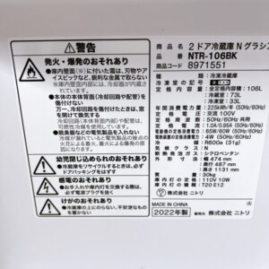 岡山県総社市で冷蔵庫買取 ニトリ Nグラシア NTR-106BK 2022年製 外装に使用感ありのため状態を加味して査定しました