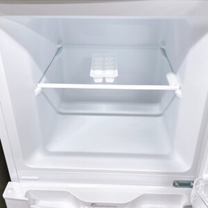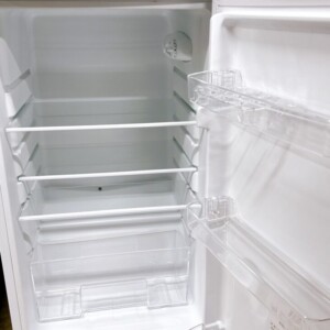 ご依頼いただいた冷蔵庫は冷蔵室・冷凍室ともに清潔な状態で、棚板やドアポケット、製氷皿などの付属品も揃っていました。目立つ汚れやニオイの付着はなく、温度調整ダイヤルを含め動作面も問題なく確認できています。外装については使用に伴うごく軽微なスレが見られる程度で大きなへこみや割れは確認されませんでした。