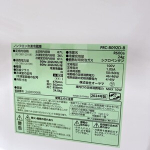 岐阜県大垣市で冷蔵庫買取 PRC-B092D-B 2024年製 庫内きれいな状態のため適正価格で査定