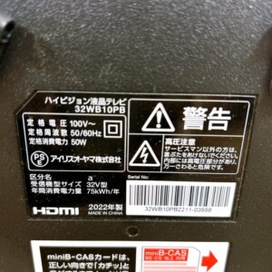 今回は京都府宇治市にお住まい40代女性主婦のお客様よりアイリスオーヤマ製ハイビジョン液晶テレビ32WB10PB(2022年製)の出張買取をご依頼いただきました。