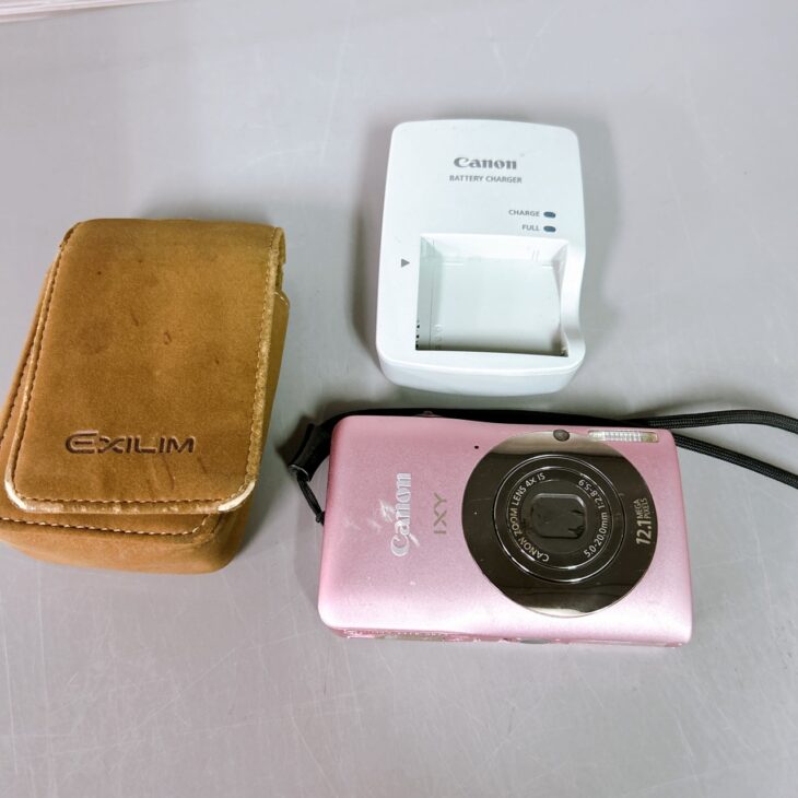 お預かりしたIXY 200Fは、外装に細かなスレや使用感が見受けられ、液晶画面にも軽い擦りキズが確認できました。撮影・ズーム・フラッシュなどの基本動作は問題なく確認でき、レンズ面に大きな欠けや割れはありません。付属品は純正充電器があり、さらに保管用のケースも付いていました。年数相応の状態ではあるものの、使用に支障がない点は評価できる内容でした。