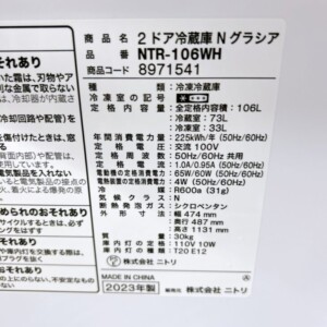 群馬県館林市でニトリ 2ドア冷蔵庫 Nグラシア NTR-106WHを出張買取 2023年製モデルを査定しました