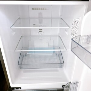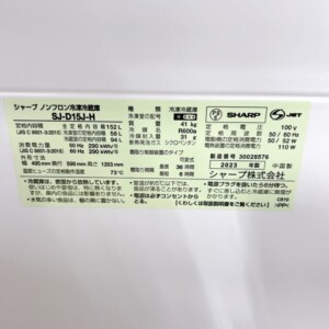お買取した冷蔵庫SJ-D15-Hは冷却動作や庫内灯の点灯など基本動作に問題はありませんでした。本体外観には日常使用に伴う若干の擦れや小さな傷、軽度の汚れが見受けられましたが、目立つへこみや破損はありません。庫内については定期的に清掃されていた様子で、清潔感があり傷や汚れは少ない状態でした。棚板やドアポケットなどの付属品も揃っています。