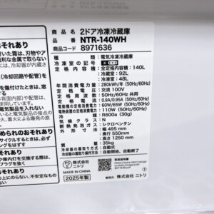 今回は広島県東広島市にお住まいの30代男性のお客様より、ニトリ製2ドア冷凍冷蔵庫NTR-140WH(2025年製)を出張買取にてご依頼いただきました。引っ越しに伴う、家電整理がきっかけです。