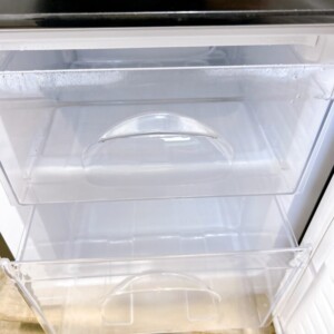 外観はブラックカラー特有の指跡や擦れ、日常使用による細かな使用感が確認できましたが、目立つへこみや大きな傷は見られませんでした。庫内は棚・ケースがすべて揃っており、冷蔵室・冷凍室ともに清潔な状態が保たれていました。動作確認においても冷却性能に問題はなく、温度調整ダイヤルも正常に機能していました。