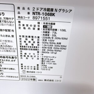 広島県呉市へ出張買取 ニトリ 2ドア冷蔵庫 Nグラシア NTR-106BK 2022年製 使用感を考慮して査定しました
