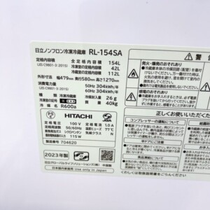 今回は廿日市市にお住まいの40代男性・会社員・夫婦世帯のお客様より、日立 ノンフロン冷凍冷蔵庫 RL-154SA(2023年製)を出張買取にてご依頼いただきました。
