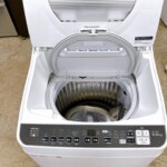 本体外観は写真の通り目立つへこみや大きな傷は見られず、全体的にきれいな状態でした。操作パネルの表示不良やボタンの反応不良もなく、通電・動作確認ともに問題ありません。洗濯槽内部はステンレス槽に大きな汚れやカビの付着は確認されず、使用感はあるものの清潔に保たれていました。給水ホース・排水ホースも付属しており、再販に支障のない状態です。
