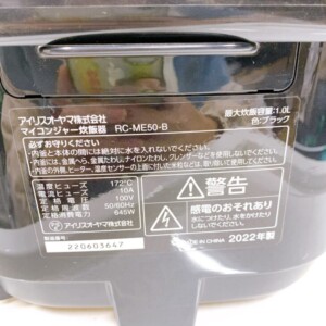 アイリスオーヤマ製のマイコン炊飯器は中古市場で一定の需要があるものの、今回は外観・内観ともに使用感が強い点と外装の傷を考慮する必要がありました。一方で、2022年製と比較的新しい点や、コード付きで動作確認が取れている点を評価し、総合的に判断した結果、今回は1,500円での査定価格をご提示しました。