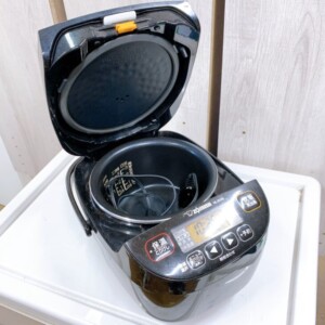 お預かりした炊飯ジャーは、外装に細かな擦れや使用に伴う汚れが見られる状態でした。操作パネルやフタ部分にも使用感はありますが、表示不良やボタンの反応不良はなく、炊飯・保温などの基本動作は問題ありません。内釜についてもコーティングの大きな剥がれはなく、日常使用としては十分に使用可能なコンディションでした。電源コードも付属しており、通電確認も済んでいます。