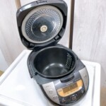 拝見した炊飯器は長期間使用されていたことが分かる状態で、外観・内観ともにかなりの使用感が確認できました。外装には手跡による汚れが目立ち、側面には小さなへこみ箇所も見受けられました。内観については内釜に傷や汚れの付着があり、コーティングの摩耗も進んでいる状態でした。ただし、炊飯・保温などの基本動作には問題はなく、通常使用は可能な状態でした。