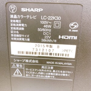 神奈川県横須賀市にてSHARP 液晶テレビ LC-22K30 使用感があるため状態を考慮して査定しました