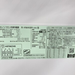 今回は千葉県八千代市にお住まいの40代女性・会社員のお客様より、HITACHI 冷凍冷蔵庫 R-HW48R(XN)(2022年製)を出張買取にてご依頼いただきました。買い替えに伴い不要になった大型家電の整理として、当社の出張買取サービスをご利用いただいております。