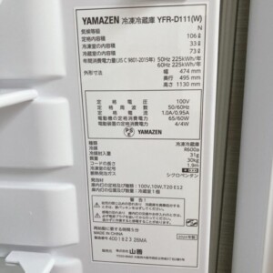 千葉県市原市にて YAMAZEN 冷凍冷蔵庫 YFR-D111(W) 106L 2024年製 美品を出張買取しました