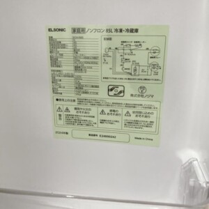長崎県壱岐市へ出張買取 ELSONIC ノンフロン冷凍冷蔵庫 ECH-R85 2024年製 庫内きれいなため適正価格で査定しました