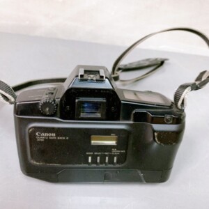 本体外装には経年保管および使用に伴う細かな擦れや小キズが見受けられました。シャッター動作、フィルム室の開閉、基本的な操作は確認でき、通電も問題ありませんでした。レンズ(EF 35-70mm)は表面に軽度のチリ混入が見られるものの、カビや大きな曇りはなく、実用範囲内の状態です。ストラップが付属しており、年代物としては標準的なコンディションと判断しました。