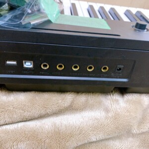 本体は全体的に日常使用に伴う細かな擦れが見られましたが、鍵盤の割れや欠けはなく、全鍵盤の反応と音出しを確認しています。操作パネルの各ボタンも反応良好で、内蔵スピーカーからの出力に問題はありませんでした。背面端子(USB、ヘッドホン端子、AUDIO OUT、フットペダル接続)も確認でき、電源アダプターを含む付属ケーブルが揃っている点は評価ポイントとなりました。