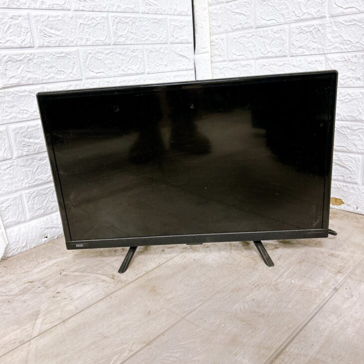 お預かりしたIRIE製24型液晶テレビは、通電・映像表示ともに問題なく動作している状態でした。画面に割れや表示ムラはなく、視聴に支障はありません。外装については、フレームや背面に使用に伴う細かな擦れや汚れが見られましたが、大きな破損は確認されませんでした。スタンドおよび電源コードは付属しており、リモコンは欠品している状態でした。