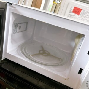 お引き取りした電子レンジは、通電およびあたため・解凍機能の動作確認を行い、問題なく使用できる状態でした。外観は全体的に使用に伴う擦れや汚れが見られ、庫内にはターンテーブル周辺に焦げ跡や取り切れない汚れが確認できました。ただし、ガラス皿の欠けや大きな破損はなく、日常使用には支障のない状態でした。