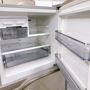 お預かりした冷凍冷蔵庫は、外観に目立つへこみや大きな傷は見受けられず、シルバー調の扉面も清潔感が保たれていました。庫内は棚板・ドアポケット・ケース類が割れや欠けなく揃っており、使用による軽度の擦れはあるものの全体的に良好です。通電確認では冷蔵・冷凍ともに冷却動作が正常で、異音や異臭も確認されませんでした。