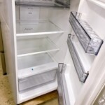 お預かりした冷凍冷蔵庫は、外観に目立つへこみや大きな傷は見受けられず、シルバー調の扉面も清潔感が保たれていました。庫内は棚板・ドアポケット・ケース類が割れや欠けなく揃っており、使用による軽度の擦れはあるものの全体的に良好です。通電確認では冷蔵・冷凍ともに冷却動作が正常で、異音や異臭も確認されませんでした。