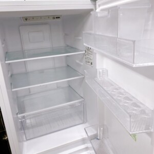 拝見した冷凍冷蔵庫は、外観に目立つへこみや大きな傷は見られず、ホワイトカラーの扉面も全体的にきれいな状態でした。冷蔵室内はガラス棚・ドアポケット・野菜ケースがすべて揃っており、割れや欠けは確認されません。庫内に強い汚れやにおいの付着もなく、日常的に丁寧に使用されていた印象です。冷凍室の引き出しも透明度が保たれており、霜の付着は軽微でした。通電確認では冷蔵・冷凍ともに正常に冷却されていることを確認しています。
