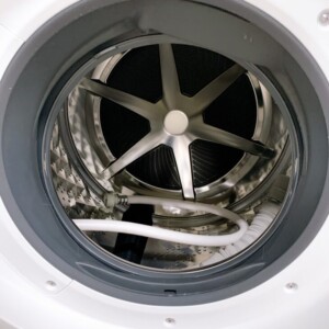本体外観には天面や側面に使用に伴う擦れや薄い汚れが見られましたが、目立つ割れや大きなへこみは確認されませんでした。ドアガラスや操作パネルにも大きなダメージはなく、全体として年式相応の状態でした。ドラム内部はステンレス槽に大きな汚れの付着はなく清潔感があり、給水ホース・排水ホースも揃っていました。通電確認および洗い・脱水・乾燥の基本動作に問題はありませんでした。
