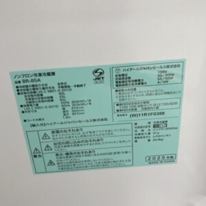 BR-85Aは容量85Lのコンパクトな2ドア冷蔵庫で、単身世帯やセカンド冷蔵庫として安定した需要があります。2025年製と年式が新しく、動作・外観ともに良好だった点を評価しました。総合的に判断した結果、買取価格3,000円での査定となりました。