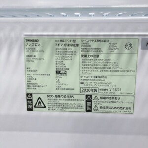 今回は福岡県福岡市南区にお住まいの30代女性・会社員・単身世帯・賃貸(アパート)のお客様より、TWINBIRD ノンフロン2ドア冷凍冷蔵庫 HR-F911(2020年製)を出張買取にてご依頼いただきました。