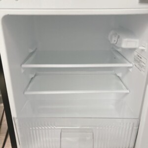 本体外観はブラックカラーで、使用に伴うごく軽微な擦れは見られるものの、目立つへこみや大きな傷は確認されませんでした。庫内は棚板・ドアポケットともに清潔な状態で、異臭や着色汚れもありません。冷蔵・冷凍機能ともに動作確認済みで、正常に冷却されることを確認しています。