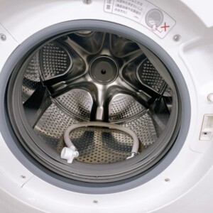 本体外観は全体的に大きな傷やへこみは見られず、操作パネル周辺も比較的きれいな状態でした。ドラム内部はステンレス槽に目立つ汚れや異臭はなく、洗濯・乾燥ともに動作確認済みで問題ありません。給水ホースなどの基本的な付属品も揃っていました。