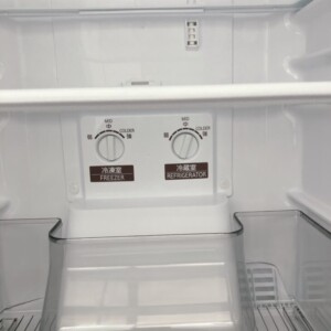 本体外観はダークグレー系カラーで、目立つへこみや大きな傷は見られず、使用に伴う軽微なスレがある程度でした。庫内は棚・引き出し・ドアポケットともに揃っており、汚れや臭い残りも少なく清潔な状態です。