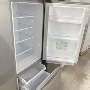 シルバー系カラーの本体外観は、目立つへこみや大きな傷は見られず、全体的にきれいな印象でした。庫内は棚板・野菜ケース・ドアポケットなどの付属パーツが揃っており、汚れや臭いの残りも少ない状態です。